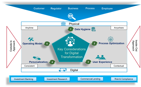 For digital transformation to succeed, there has to be a holistic approach covering both its physical (e.g., branches) and digital (e.g., devices, applications, etc.) aspects including social, mobile, analytics, and cloud. Further, while defining the strategy, it has to be evaluated properly through five core lenses: customer, business, process, employee, and regulator. The focus should be on the following five key considerations.