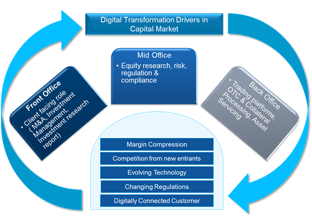 The Capital Market division (buy and sell sides) of banks and financial intermediaries, such as stock exchanges and clearing houses, have started to realize the need for digital transformation of their business. These institutions across the globe are planning to use cutting edge technologies, including blockchain, machine learning, and robo advisors, as they make digitization part of their day-to-day business. Capital markets firms are compelled to embark on this journey because of the following internal and external factors: